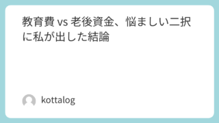 家計管理 教育費 vs 老後資金、悩ましい二択に私が出した結論 教育費と老後資金の優先順位をどう決めるかを実例で解説。賃貸世帯前提で、公立高+私立大(自宅通学)の試算、児童手当の活用、積立の目安、奨学金の不足対応(親が返済サポート)まで。老後は子ども独立後の10年集中+退職金で回収する想定。 2025.10.05 家計管理